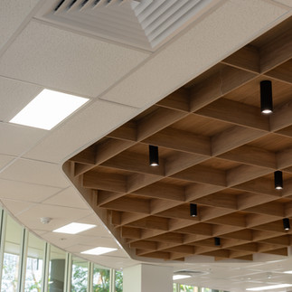 One key challenge was integrating services into the custom acoustic feature ceilings without compromising the design intent, while maintaining a cohesive approach across the multiple spaces. Coordination with services engineers and Autex (the acoustic feature ceiling manufacturer) was critical, and installation had to be precise to ensure all elements were incorporated seamlessly. When working within an existing building there will likely be latent site conditions that cannot be planned for, and this project was no different. A few latent site conditions were found during construction, however the project team were able to work together to achieve the best outcome possible for the condition without affecting overall design intent.