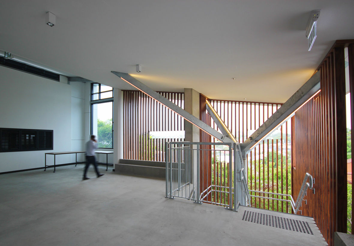 Selected red brick that tie with the existing buildings that date back to the 1920s. Timber look battens clad the façade and blend with the surrounding character trees on site. These trees were emulated through the spine of the building’s staircase, in the form of a sculptural tree element that acts as feature lighting and structural support. Large windows allow natural light to flood through the building’s internal passages while framing spectacular outlooks to the surrounding neighbourhood.